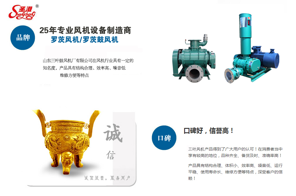 山東三葉鼓風機廠有限公司(原章丘市三葉鼓風機廠)創(chuàng)建于1990年,是專業(yè)生產羅茨鼓風機、羅茨真空泵、增壓泵以及回轉式風機系列產品的廠家,南靠309國道、膠濟鐵路線,北接濟青高速公路,地理位置優(yōu)越,交通便利。本公司本著“質量第一、誠信為本”的指導方針,經過十多年的發(fā)展,以過硬的產品質量,及時完善的售后服務已在市場中占領一席之地。本公司生產的風機噪音低、高效節(jié)能、外型美觀;風機進、排氣口采用螺旋形狀,使進排風過程按螺旋線的方向循序切入。產品具有結構合理、體積小、效率高、噪音低、運轉平穩(wěn)、使用壽命長、維修方便等特點。歡迎各界朋友親臨公司洽談業(yè)務,指導工作,攜手并進共創(chuàng)美好未來!